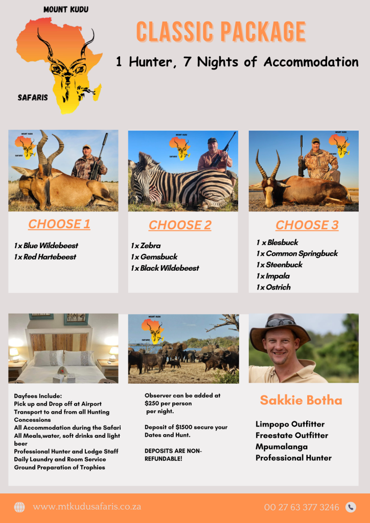 This Package is designed for the pleasure of 1 Hunter with a 7 night stay, Hunting a variety of 1 Specie.